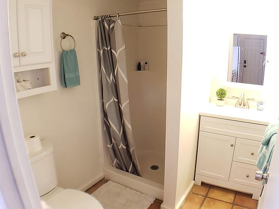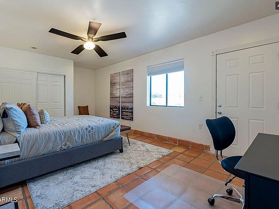 Home has huge bedroom with a queen bed and night stands, large closet, plus den area with desk and chair. Bright bathroom with shower and vanity. 2nd bedroom or office has separate external entrance and has a twin bed.