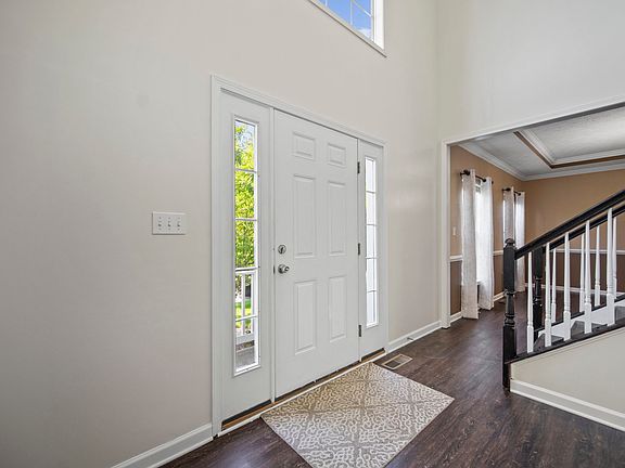Step into a warm, inviting foyer featuring luxury vinyl flooring, leading to a bright dining room accented with a tray ceiling. A versatile living room offers the perfect space for a home office, study, or quiet retreat.