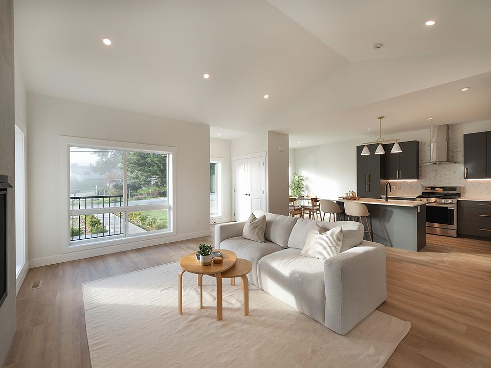 Brand new 3-bed, 2-bath rancher offering bright, easy coastal living. Featuring 9-ft ceilings, oversized windows, and an open layout, the home feels airy and inviting throughout. The kitchen boasts quartz countertops, stainless steel appliances, contemporary cabinetry, and an island for gathering. A stunning floor-to-ceiling fireplace anchors the living room, adding warmth and style. The primary offers a spa-inspired ensuite with double vanity and a walk-in closet. Enjoy natural gas heating, heated bathroom floors, a double garage, and a fenced yard. Newly completed concrete driveway, entry path, and rear patio pad are perfect for outdoor entertaining. Minutes to town and two blocks to the beach. Crafted with quality construction and backed by a 2-5-10 New Home Warranty.