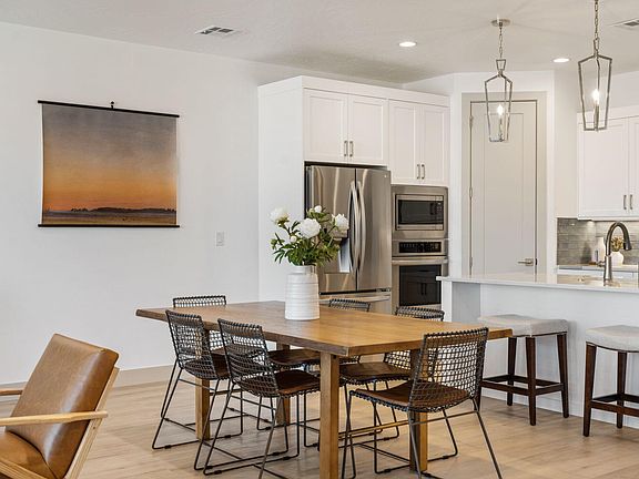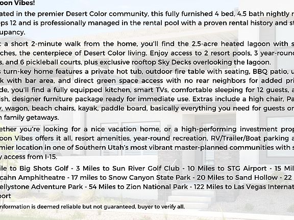 Lagoon Vibes! Located in the premier Desert Color community, this fully furnished 4 bed, 4.5 bath nightly rental sleeps 12 and is professionally managed in the rental pool with excellent performance. Just a 2-minute walk to the 2.5-acre heated lagoon with sandy beaches, plus 2 resort pools, 3 hot tubs, and 6 pickleball courts. Home includes a private hot tub, outdoor fire table, BBQ patio, upper deck with bar seating, paddleboard & kayak, and direct green space access with no rear neighbors. Inside offers a fully equipped kitchen, smart TVs, and a turn-key furniture package. There is also boat, trailer or RV parking within the community.