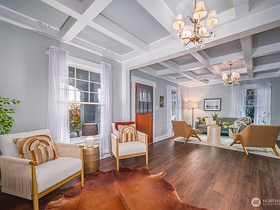 Updated kitchenMature perennialsEnglish-style tiered gardenBackyard viewsOriginal moldingsUnique lightingArched doorways