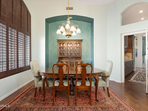 Warm wood accents complement the kitchen and master suite, while the cozy family room includes built-in storage and a Smart TV that conveys with the home. The split master retreat offers a luxurious bath with a custom walk-in shower and separate tub. Three additional bedrooms, provide comfort and flexibility. Step outside to a private backyard oasis with a sparkling pool, travertine patio, turf lawn, mature landscaping, and elegant lighting ideal for relaxing or entertaining under the Arizona sky.