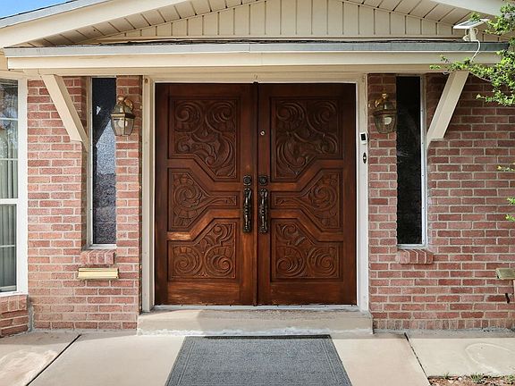 Double doors welcome you into a spacious layout featuring two distinct living areas, a large formal dining space, and a dedicated home office with built-in shelving and natural light. The living room showcases a brick fireplace and oversized windows, creating a warm and inviting setting. A separate breakfast area connects to a galley-style kitchen with double ovens and vintage cabinetry that blends charm and function. French doors in the main bedroom open to a backyard filled with mature trees, curved concrete patios, and a detached structure offering flexible use as a workshop or storage. Multiple sliding glass doors provide seamless indoor-outdoor access, ideal for gatherings or relaxing evenings. With four bedrooms, two bathrooms, and thoughtful architectural details throughout, this property offers both comfort and versatility in a centrally located El Paso neighborhood. VA assumable at a 2.75% interest rate!