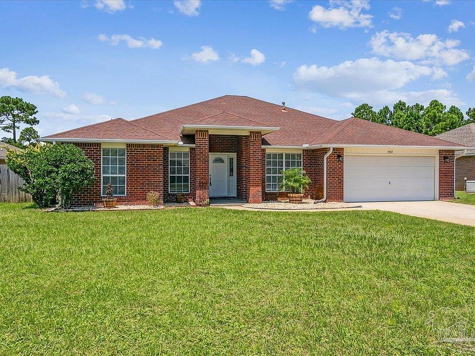 LOCATION! LOCATION! LOCATION! This beautiful brick home is tucked away in the back very desirable Estates at Emerald Shores subdivision. You’ll enjoy all that this home has to offer that includes built-ins at foyer/entry hallway, high ceilings, engineered hardwood flooring in most of the main areas, tile flooring in kitchen, breakfast/dining nook, laundry, baths and sunroom, a spacious living room with gas fireplace, and large windows allowing plenty of natural light into your cozy gathering space. The kitchen offers granite countertops, wood cabinets, stainless appliances, tiled backsplash, island, pantry and a breakfast/dining area and laundry just off the kitchen. There’s also a dedicated dining area (i.e., “formal dining”) to accommodate larger gatherings around the table. There are 4 bedrooms and 2.5 baths; main bath has a double-vanity, stylish wood cabinets & large wood-framed vanity mirror, updated vanity lighting, garden tub, separate walk-in shower, private water closet and oversized main closet. The backyard is privacy-fenced with plenty of space for those weekend gatherings for cookouts, and to maybe install a pool. The oversized 2-car garage is equipped with garage door opener & pulldown stairs to the attic. There’s a sprinkler system on irrigation well, and a whole-home generator to offer convenience and comfort. So many wonderful features in this home, PLUS being in close proximity to the back-gate of NAS Pensacola, Naval Aviation Museum, Blue Angels practices, shopping, restaurants, downtown Pensacola, golfing, boating facilities, Big Lagoon State Park, Gulf Islands National Seashore on the sugar-white beaches and emerald green waters of Perdido Key, this is a great place to call HOME! Call TODAY to schedule a showing!