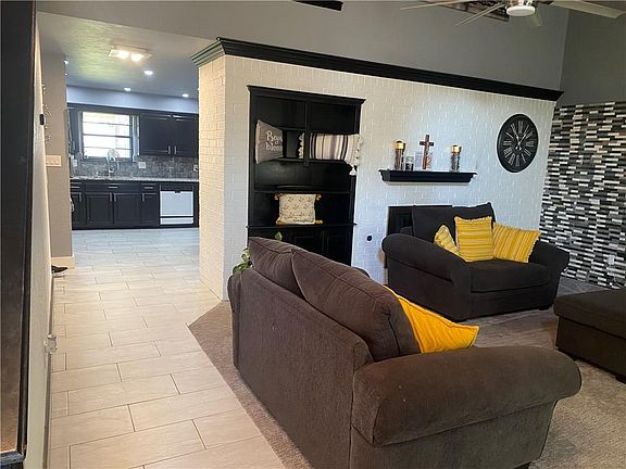 Welcome to your new mid-century modern dream home! From the moment you enter get ready to be impressed with stunning elevated ceilings, brick surround gas fireplace with built-ins, aesthetic stone accent wall, and an abundance of windows for plenty of natural light. The updated kitchen includes granite countertops, new tile throughout, drop-in stainless steel gas range, doggie door access, and plenty of room for eat-in dining. The sunroom off of the kitchen boasts gorgeous woodwork details, with access to the covered patio and large backyard. The primary bedroom on the main floor has two closets, with FOUR additional large bedrooms upstairs. This home has it all with easy access to Lake Hefner, highways, and all your favorite restaurants and shopping. With plenty of room to make your own mark, don't miss out on this stunning home today!