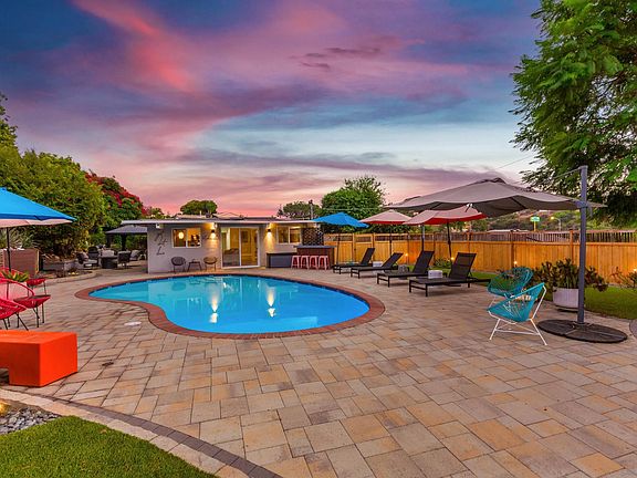 Mid century modern stunner! Fully remastered with Palm Spring vibes this home will have you feeling like you are in your own resort. Options abound, privacy off the primary to jacuzzi and outdoor shower, or soak in the sun by the pool and bbq/entertain. Open layout with a fabulous kitchen island, designer bathrooms and primary retreat with beautiful walk-in closet. On over 1/3 acre, room for RV, new 200amp panel, new roof and so much more. This is a cant miss home!