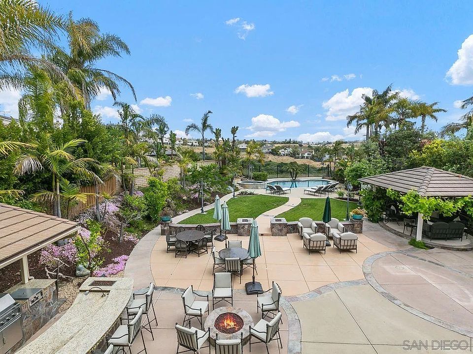 This fabulous home offers executive style living with a large oversized canyon view lot. Entertain in style with a resort style pool, spa, covered patio, fire pit and built in BBQ. The chefs kitchen offers plenty of space with breakfast nook, beautiful backyard views, wonderful storage and an oversized pantry. The spacious primary bedroom has a large sitting area with fireplace and includes his and hers closets and grand master bath. A large bonus room upstairs can be used as an office, playroom or theater. Downstairs includes two bedrooms and full baths for guests and relatives. This home is an entertainers delight and includes a 3 car garage. Easy access to shops and freeways and best school district in San Diego county.