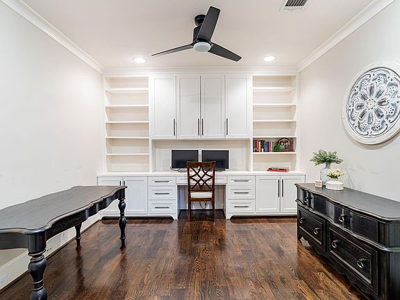 Wood-burning fireplaceFenced yardStainless steel appliancesPrivate home officeLuxurious hardwood floorsCovered patioSolid wood doors