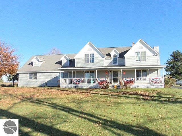 This Large, 8 Bedroom / 7 Bath, Colonial-Style Home in the beautiful rolling hills of Leelanau County. Has a large front farmers porch and a back porch with 2.5 acres and a 2+ car detached garage. Perfect for a large family or as an income producing venture such as a Bed and Breakfast or Adult Foster Care. Home is vacant, freshly remodeled and professionally cleaned, and ready to move into. Has an outdoor wood-burning (optional gas) furnace / water heater and central air/heat with gas fireplace. Modern kitchen with oak cabinets and all major appliances. Large Michigan Basement for ample storage.