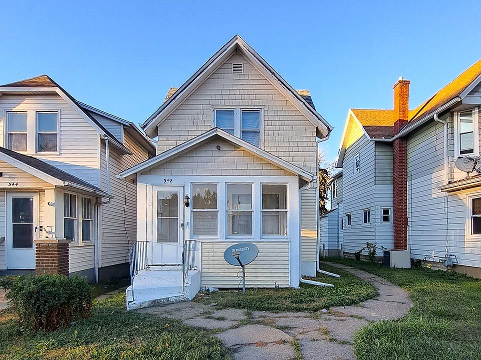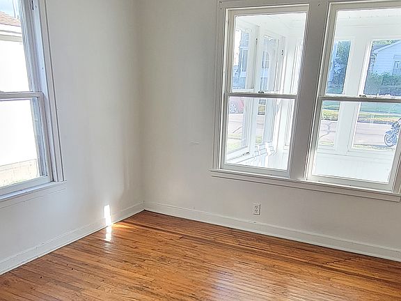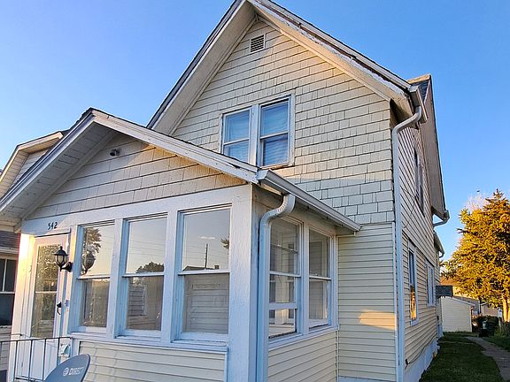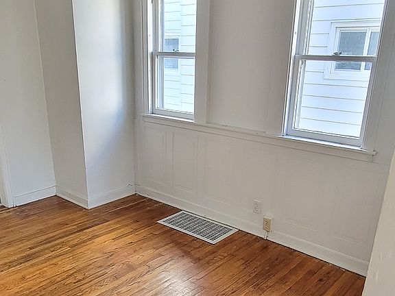 Clean and bright 4-bedroom house with detached garage. Recently repainted exterior and enclosed front porch. Crisp white walls are warmed by original hardwood floors throughout much of the home including front living room and formal dining room with walk-in closet under stairs. Kitchen sports lots of white cabinets and generous counter space, newer vinyl plank flooring, and includes fridge and oven range. Rear first floor bedroom with newer vinyl flooring, 2 closets, and lots of windows. Upstairs are 3 more bedrooms. One carpeted, the second captive with hardwood flooring, and the third adjacent to the spacious jack and jill bathroom with combo tub/shower and linen closet. Ceilings fans throughout. Unfinished basement with laundry hookups. Detached garage facing back alley.