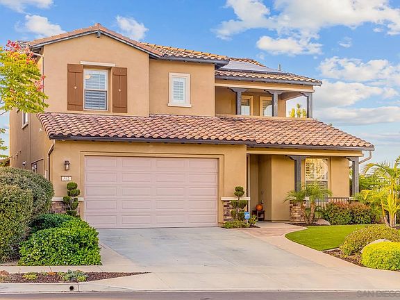 Welcome to 542 Adobe Estates Drive, a stunning 4-bedroom, 2.5-bath home tucked away on a peaceful cul-de-sac in the gated community of Laurel Pointe. This spacious residence offers 3,360 SqFt of beautifully designed living space on a 7,880 SqFt lot. The home features 9-foot ceilings throughout and wide plank white oak flooring that flows seamlessly through the open living areas. Large windows fill the home with natural light, creating an inviting and airy atmosphere. The main level includes a generous primary suite with dual vanities, a soaking tub, separate shower, and an impressive 15-foot walk-in closet. A dedicated office with custom cabinetry sits at the front of the home, and the laundry room is conveniently located on this level. Upstairs offers a large loft, separate game room, three additional bedrooms, a full bathroom, and a balcony. The backyard is perfect for entertaining with a sparkling pool and spa, built-in barbecue, and glass fire pit. With no home directly behind, the yard offers privacy along with scenic mountain views and a clear view of Vista Sports Park. Additional highlights include low-maintenance turf in the front yard, concrete walkways, a 15-panel owned solar system, an EV charging station, and a tandem garage with extra space for storage or a workshop. Located next to Vista Sports Park, just 8 minutes from Costco and 15 minutes from the beach, this home blends comfort, convenience, and North County living at its best!