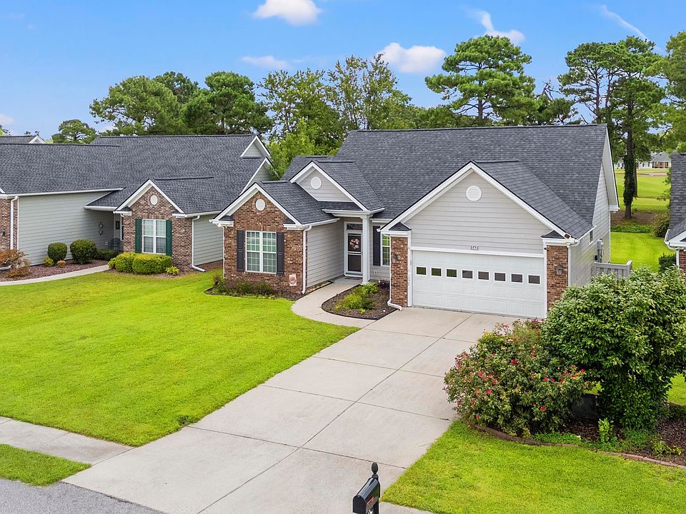 Enjoy golf course views from this 3 bedroom, 2 bath home in the 55+ community of Myrtle Trace South. A spacious living and dining area with high ceilings and a fireplace makes gathering comfortable, while the kitchen offers a breakfast bar, pantry, and a bright nook overlooking the fairway. The primary suite also faces the course and includes a walk in closet and private bath. Two additional bedrooms and a full bath are set at the front of the home, giving privacy for guests or office space. An oversized two car garage with storage connects to the laundry room for everyday convenience. Lawn care is included through the HOA along with access to the pool and clubhouse. Just minutes to restaurants, shopping, and medical offices, and only a short drive to the beach.