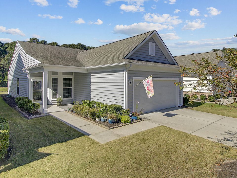 Looking for a truly move-in ready home in the lovely Del Webb community in Cane Bay Plantation? Come see this pristine home with custom interior finishes! The ever-popular Taft Street floor plan has plenty of space and boasts 2 bedrooms, 2 baths and an office. Best of all, this amazing home sits on a rare and highly-desirable lot that backs up to woods and a lagoon. Enjoy the wonderful view each morning and evening from your screened porch. You will love the updated kitchen with birch cabinetry, quartz countertops, a stainless-steel farmhouse sink, gas range, and double door pantry. Beautiful kitchen island with storage. A chef's dream! In addition, you will love the hardwood floors in the main living areas and office with French doors.The family room has a built-in entertainment unit, shiplap accent wall and updated trim details to give this home a unique feel. The Owner's suite is fabulous with an updated bath featuring custom tile floors, double sink quartz vanity with shiplap accent wall and custom mirrors, faucets and vanity light, a walk-in shower and walk-in closet. Away from the Owner's suite is a guest bedroom down another hall and a full bath updated with tile floors, a quartz vanity, framed mirror and custom faucet. The laundry room includes the washer & dryer and extra cabinet storage. A flex space with French doors sits off the foyer and is the perfect room for an office, second den, or extra bedroom. 2025 HVAC and garage walls finished. Start living your best life in this wonderful Active Adult community convenient to all that Charleston and Summerville has to offer! So many activities to get involved in with over 100 chartered clubs and a full events calendar. Just minutes from grocery stores, restaurants, and medical facilities. This home has it all with interior updates and a new HVAC to give you peace of mind!