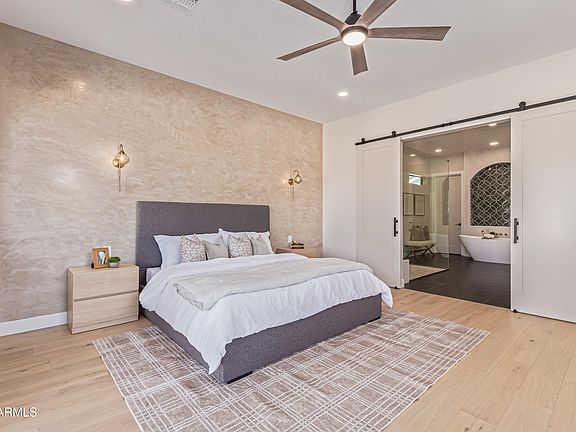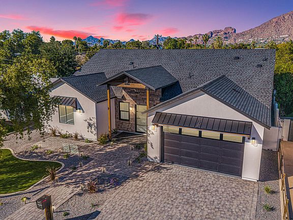 BRAND NEW CONSTRUCTION! Now offered at a compelling value for Lower Arcadia NEW BUILD. Modern-cottage warmth meets elevated design-- complete with a BRAND NEW POOL and Camelback Mountain views! A three-panel steel patio door frames the view from the entry and opens to a private yard designed for easy entertaining: Baja shelf pool with sculptural water curtain, twin gas fire features, and low-maintenance landscaping. Inside, natural tones (soft greens/blues), walnut accents, and micro-cement details create a calm, cohesive palette. The plan includes a serene primary retreat with a private coffee patio, plus a separate ensuite flex room opening to the pool--ideal as a guest suite, studio, or office...(SEE MORE).... The chef's kitchen flows to the great room, anchored by a floor-to-ceiling charcoal stone-tile fireplace. Grounds are fully finished with Ficus privacy screening and drip irrigation. Move-in ready and crafted with meticulous attention to detail.