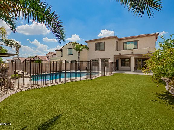 Step outside to your own private oasis, an extended covered patio overlooking lush artificial grass, a fenced pebble-tec pool with waterfall, and plenty of space to relax or entertain.