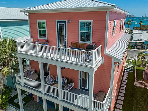 Beautiful, contemporary, high-end primary home, vacation rental, or commercial property - Zoned Waterfront Redevelopment District, so options are limitless.  Built to current building codes with occupied floors well above flood level and 145mph hurricane rating.  Currently held as investment property earning $124,000 in 2024.  Every bedroom is a suite with private bath and balcony.