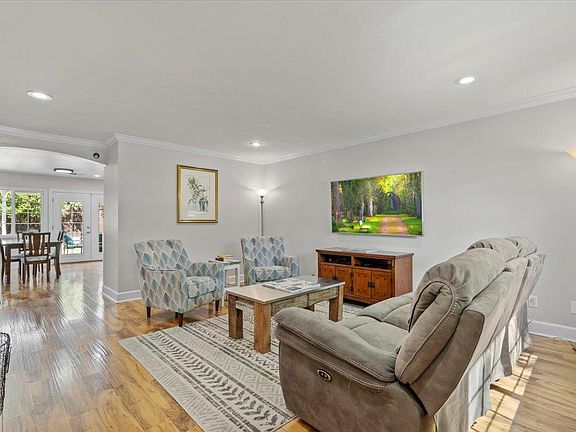 Updated light and bright single story home- meticulously maintained and upgraded with a stately Mimosa tree gracing the front yard. Newer kitchen and baths, newer roof, and furnace. Ducting recently cleaned. Easy care flooring throughout- no carpet in living areas or bedrooms. Fresh interior paint. The kitchen has an island, quartz counters with tile backsplash, easy close drawers, large stainless steel sink, newer appliances including the refrigerator, a pantry and French door access to the backyard. The baths have quartz counters and new sinks. LED lighting, newer light fixtures, Crown molding in many rooms. The primary has double French doors to the back yard and a walk in closet with shelves and double hanging rods. Great storage with additional main bath large closet and 3 hall closets. Ceiling fans in bedrooms and a Ring doorbell! Come see this delightful home!