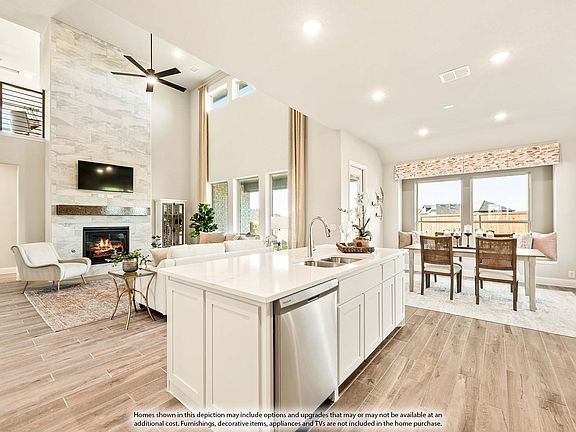 *Contact Community Manager for incentives!* NEW! NEVER LIVED IN. Ready March 2026. Located in the Hayes Crossing community, this Bloomfield Homes Seaberry II offers 4 bedrooms, 4 baths, and 3,278 square feet in a two-story layout with a J-swing 2.5-car garage accented by cedar garage doors. The brick and stone exterior delivers strong curb appeal, complemented by full rain gutters and an extended patio that supports easy outdoor living. An 8-foot glass front door creates a welcoming entry. Inside, 8-foot doors continue throughout the first floor, and large windows enhance the open feel across the main living spaces. The family room is highlighted by a wood-burning, stone-to-ceiling fireplace with a cedar mantel. Just beyond, the Deluxe Kitchen is thoughtfully designed with quartz countertops, a double oven, 5-burner cooktop, built-in stainless steel appliances, pendant and under-cabinet lighting, and cabinets extended to the ceiling with glass fronts and interior lighting. A large island sits at the center of the kitchen, while a butler’s pantry and trash roll-out add smart storage and convenience. A private study enclosed with glass French doors offers a quiet space for work or hobbies. Wood stairs lead to the second floor, where 2 secondary bedrooms each include walk-in closets and are served by 2 full baths. A game room and media room round out the upper level, creating dedicated space for downtime. Located in Hayes Crossing, residents enjoy access to community amenities including a playground, trails, and a pavilion. Classic Series standard features include elongated toilets, decorative top crown molding on cabinetry, lever-style door hardware, and 5-inch baseboards on the first floor. Visit the Bloomfield Homes model at Hayes Crossing to see the Seaberry II and experience this home in person.