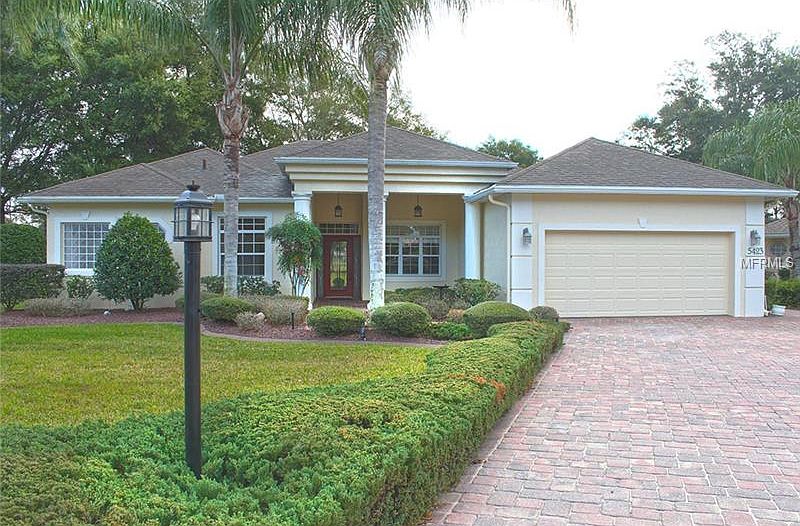 HARBOR HILLS.....GOLF FRONTAGE! Gated community minutes to The Villages... no rear neighbors ....double fairway view. All the "bells and whistles" in this stunning home to include....elegant columns covered portico, volume ceilings, tiled floors, tray ceilings, bead board, crown moulding & custom woodwork. Foyer leads to formal living & dining area with columns & deco accent lighting, gated wine alcove. Recessed sliding doors lead to 576 sq. ft. of tiled lanai with spectacular views. "Chef of the house" will appreciate upgraded kitchen. Stainless steel appliances....side/side refrigerator, smooth top range, dishwasher, Microwave/convection, under counter lighting, tiled back splash, custom wood cabinets with granite counter tops, walk in pantry & snack bar opening to your "morning coffee" breakfast area. Master suite with walk in closets & his/her vanities. Garden tub for "bubble bath" relaxation & separate shower. Spacious guest bedrooms feature "Jack n Jill" bathrooms with granite counters.....Office/ Den great for business or "man cave". Inside laundry room. Designer window treatments include Roman Shades. Replaced AC in 2009. Water softener/filtration. Oversized garage with shelving & cabinets. Partially floored attic. Gutters around entire home. Brick paver driveway with professionally landscaped manicured lawn include curbing & Seminole stone. Enjoy a "breath of fresh air" yet minutes to town. There is a pathway to the clubhouse, driving range and pool only 4 homes away and a very short walk.