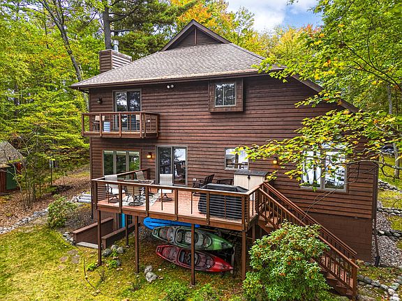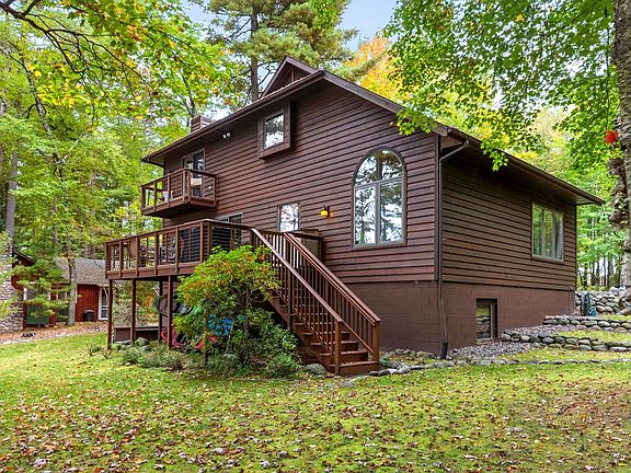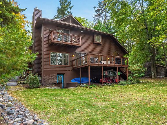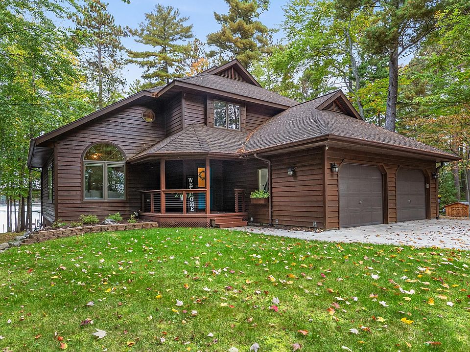 Level west exposed (awesome sunsets) 100FF sand frontage lot with elevated quality custom built modified 2 story residence. Lake views from residence, decks, and fire ring perfectly framed by mature trees. Walkout basement includes a large family room with gas FP, bath, bedroom/office, & storage & mech. rooms. Covered front porch serves entry/foyer (open stairwell & french doors to living room), oak kitchen with solid surfaces and well sized island (seating), dining room, den/sitting room with wet bar & gas FP, bath, and laundry. Second-story features primary bedroom (with balcony) and bath (jetted tub) & walk-in closet. Two other bedrooms and a bath also present. Attached 2 car garage is insulated, lined, & heated, with concrete apron and asphalt drive. Located on Bass Lake of the Rhinelander Flowage, offering 1,300+ acres of four-season recreation. Navigabe to several bar/restaurants. Favorable privacy. Dead end road. Convenient to town.