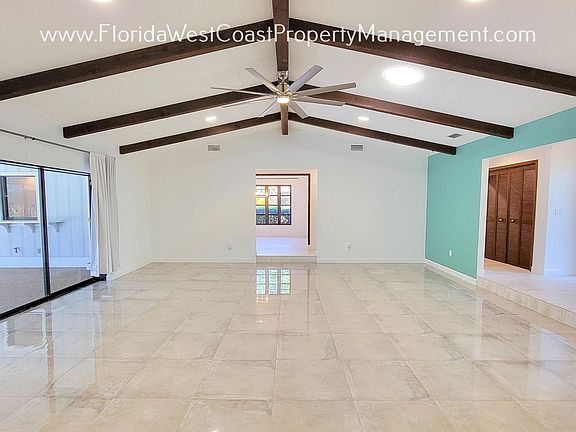 Upon entering the home you are met with direct views into the HUGE all tile living room through to the LARGE screened patio and pool! The design and feel of the the volume ceilings and exposed beams is on point!