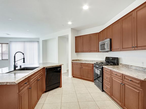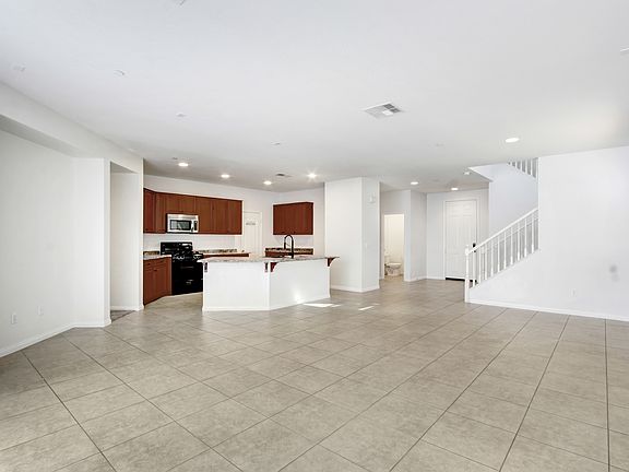 The open floor plan features a large living and dining area with neutral tile flooring and plenty of natural light ideal for relaxing or entertaining guests. The kitchen boasts ample cabinet space, granite-style countertops, a center island with breakfast bar seating, and a mix of black and stainless-steel appliances, including a gas range and built-in microwave.