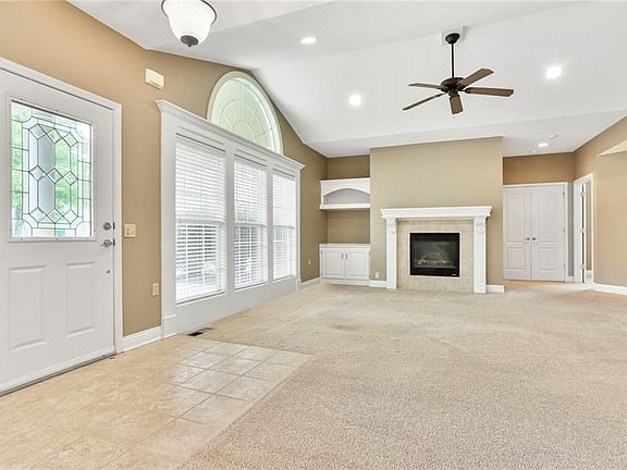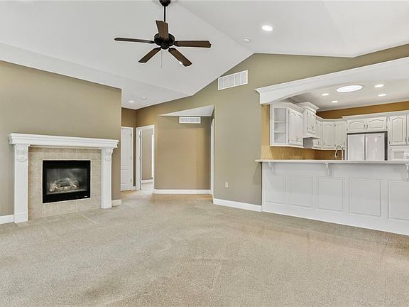 Inside, you'll find vaulted ceilings, abundant natural light, and a cozy gas fireplace that anchors the main living area. The kitchen includes solid-surface countertops, tile backsplash, white cabinetry, and a full appliance suite. A raised breakfast bar connects the kitchen to the dining and living spaces—perfect for entertaining or everyday living.