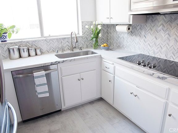 Fantastic top-floor 2 bed, 2 bath mid-century modern condo in the desirable Shelbourne Towers complex of Encino. This beautifully updated unit offers mountain views (snow-capped in winter) from your private balcony and features a stylish mix of wood, tile, and luxury vinyl plank flooring throughout. Each bedroom is large with lots of storage and the primary suite boasts a his-and-hers walk-in closet. The kitchen boasts modern quartz countertops, marble backsplash tile, french door refrigerator and stainless steel appliances - all included with the unit. Both bathrooms have been thoughtfully renovated with elegant tile work and contemporary fixtures.