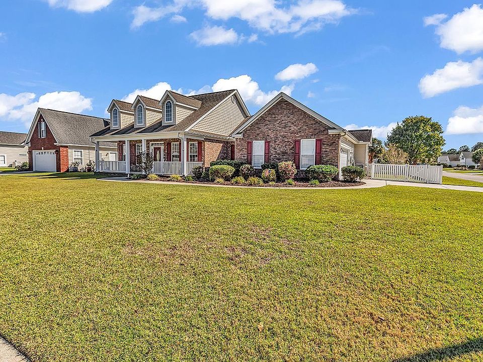 Put this home at the top of your must-see list! Situated on a large corner lot in the desirable Hillsborough community of Conway, this beautiful 3-bedroom, 2-bath ranch combines warmth, comfort, and recent improvements. A welcoming 27-ft front porch framed by a brick veneer opens to a bright foyer with 17-ft ceilings and engineered wood floors. The open living area features a cathedral ceiling and gas fireplace recently cleaned and serviced that anchors the room with charm. The kitchen is a chef’s dream, offering Corian countertops, 42-inch oak cabinets with crown molding, tile flooring, pantry, breakfast bar, and an inviting nook overlooking the backyard and pond. The split-bedroom layout ensures privacy, with the primary suite featuring tray ceilings, a large walk-in closet, and a spacious bath with dual vanities, jetted tub, and separate shower. Step outside to relax on the screened porch or enjoy the fenced-in backyard with an irrigation and sprinkler system, peaceful pond views, and plenty of space for pets, grilling, and outdoor living. Recent updates include a cleaned gutter system, refilled propane tank, transferable termite bond, and a Bryant Evolution HVAC with Wi-Fi thermostat. The oversized two-car garage, attic storage, and wide driveway provide plenty of room for vehicles and tools. Hillsborough offers a clubhouse, playground, and community pool, all just minutes from International Drive, shopping, dining, and the beaches of Myrtle Beach. If you’re seeking a home that blends space, style, and convenience, this one truly stands out!