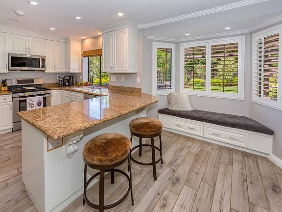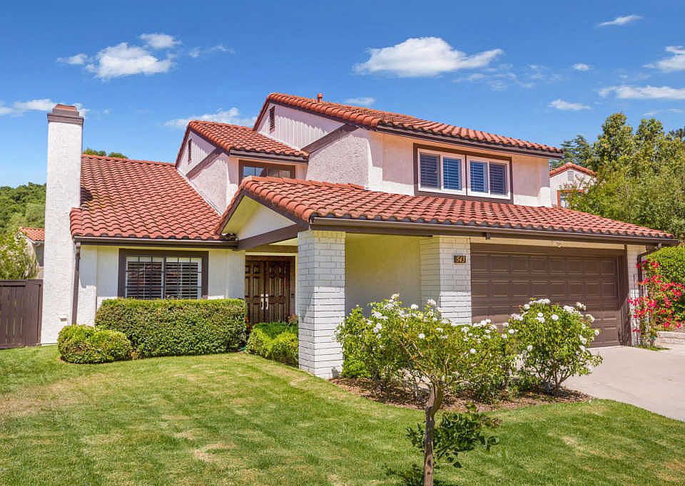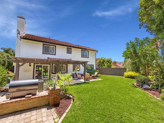 Instant curb appeal draws you to this beautiful home located in prestigious Wood Ranch. This two story home offers plantation shutters, crown molding, recessed lighting, gorgeous porcelain flooring throughout the main floor with new carpet on the upper level. All bedrooms are spacious and inviting. Large master suite includes an updated bath, new wall mounted closet cabinetry and large walk-in closet. Downstairs bedroom currently being used as pilates/spin room. Enjoy summer BBQs in this large private, peaceful backyard perfect for entertaining or just relaxing. Outdoor living at its finest with lush landscaping, fire pit and pavers. Don't miss seeing this Wood Ranch gem.