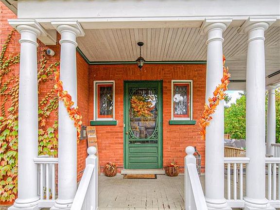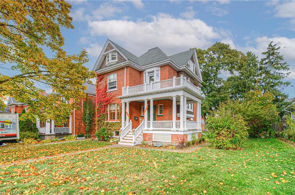 This is the home you've been waiting for! Often admired, this red-brick Queen Anne–style century home is finally available. Built in 1905 and lovingly cared for by the same family for more than 60 years, it sits proudly on one of the prettiest tree-lined streets in Cambridge—just one block from Uptown Preston. As you approach, the craftsmanship of the wrap-around covered veranda, rebuilt in 2015, immediately stands out. Leaded-glass windows frame the front entrance, while a distinctive shingled gable with both round and Palladian windows graces the home’s south side classic hallmarks of its historic design. Inside, a bright and welcoming foyer opens to generous living and dining rooms featuring pegged oak floors, nearly 10-foot ceilings, and original glass-panelled pocket doors. The living room is anchored by a wood-burning fireplace, while the dining room offers bay window seating and a charming built-in China cabinet that speaks to the home’s character and history. The spacious eat-in kitchen provides plenty of workspace and storage, complemented by a functional butler’s pantry, and a powder room. Upstairs, the beautiful oak staircase leads to a large landing that connects to three generous bedrooms and a roomy family bathroom. While the bath awaits your modern touch, its size and separate water closet offer incredible potential. The upper attic bright and full of character could easily be transformed into a luxurious primary suite, studio, or family room. The expansive 58’ x 143’ lot provides ample space for a pool, garden, or future addition, and the detached single-car garage with reinforced bracing and a newer roof complements the six-car driveway. This home has seen thoughtful updates while preserving its original charm, including a new fence (2022), balcony door (2023), flat roof (2023), chimneys and flute (2023), landing bay windows (2023), attic windows (2023), all exterior cedar shakes (2023), hot water tank (2024, rented), and new porch steps (2025).