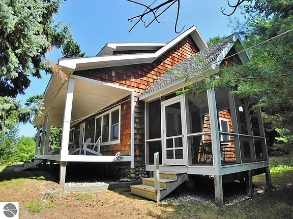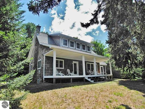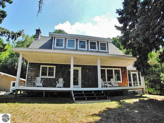 This charming Cape Cod style home with Cedar Shake siding is located on a quiet 1.14 acre parcel just 2 miles east of Suttons Bay on desirable Stony Point Peninsula and features 3 bedrooms, 2 baths, hardwood floors, vaulted wood ceilings, partially finished basement, oversized 2 car detached garage, and over 400+ sq ft of wonderful outdoor living spaces including a large covered front porch and a side screened-in porch.