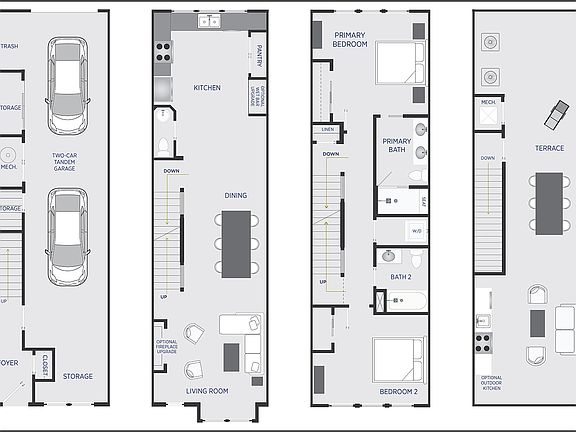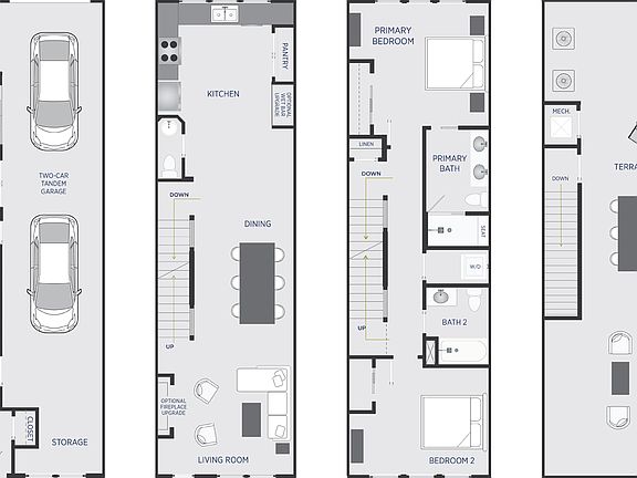 Move-in begins Summer 2021. Take advantage of pre-completion pricing. The Lela floor plan is located in Building 3 on a quiet Alley. This 3-story, 2 bedroom, and 2.5 bath home with Traditional Platinum interior finishes has an open floor plan and large windows to flood each floor with natural light, wide plank flooring, an optional fireplace, and a rooftop terrace. Enter the home on the first level with a 2-car tandem garage and extensive storage. The second level, perfect for entertaining, offers a gourmet kitchen with custom cabinetry, a stainless steel appliance package, a desk area and optional wet bar and island upgrade, a spacious living room with an optional fireplace, and a dining area, and a powder room. On the third level, you will find the spacious primary suite with a luxurious double vanity bath and glass shower, a secondary bedroom, a full bath, and a convenient laundry room. On the roof level, enjoy the outdoors year-round on a private terrace with upgrade options available.