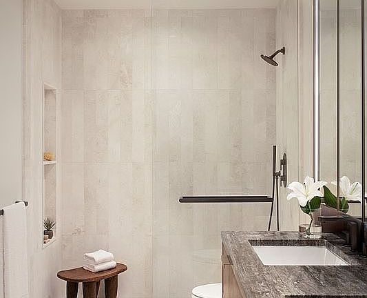 Vandewater's interior design speaks to an old school design approach and showcases the beauty of the materials in a new and thoughtful way - oversized, high performance casement windows, tall ceilings, and European white oak floors. Elegant kitchens offer honed Perla Venata kitchen counters, chef caliber Miele appliances and custom, craftsman inspired oak cabinetry with pewter hardware. Primary bathrooms are outfitted with honed Windsor Cream marble, soaking tub, large shower with frameless glass enclosure, pewter fixtures, and custom oak and travertine vanities. All homes have the latest hvac technology from Climatemaster, laundry equipment from Whirlpool or GE, and recessed LED lighting. All residences have remarkable light, garden views and dramatic city vistas from the top third of the building. Preserved views in every direction allow for virtually no obstructions past the 20th floor, providing views of the George Washington Bridge, Hudson River, Central Park, downtown Manhattan and beyond. Select residences have outdoor terraces.