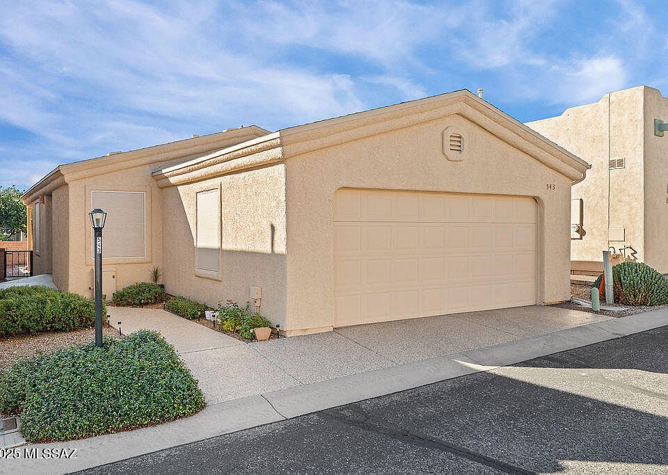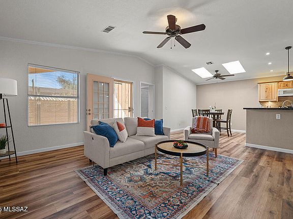 Tucked away on a quiet dead-end street, this beautifully updated two-bed, two-bath townhome with a two-car garage offers comfort, privacy, and convenience just seconds from the community center featuring a heated pool, hot tub, fitness and spacious gathering areas.Recently painted inside and out, this home shines with an open floor plan, vaulted ceilings, skylights, crown molding, and luxury vinyl plank flooring throughout--NO carpet anywhere. The kitchen was fully updated in 2022, showcasing solid granite countertops, tile backsplash, a pot filler over the range, and beautiful knotty pine cabinetry. Just off the kitchen is a separate laundry and pantry room for extra storage and ease. The split bedroom layout provides privacy for guests, while the primary suite includes a private bath. Newly installed solar screens enhance energy efficiency, minimizing heat while maintaining the home's bright, natural light. Outside, enjoy low-maintenance desert landscaping, a new irrigation system, and a covered patio with epoxy-coated concrete that extends to the walkway and garage floor for a clean, finished look.