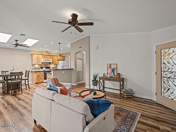 Covered patioOpen floor planNew irrigation systemSplit bedroom layoutLow-maintenance desert landscapingNewly installed solar screensTile backsplash