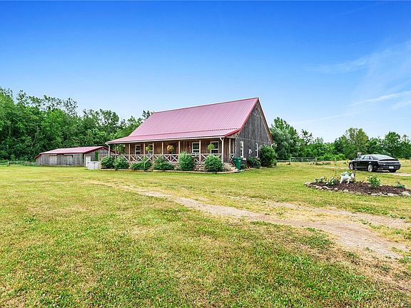 Welcome to 5430 State Route 14, Sodus, NY! This stunning rustic-style farmhouse on 8 acres features fenced pastures and a charming deep covered porch. Inside, the great room boasts cathedral ceilings and a floor-to-ceiling stone fireplace. The slate floors lead to a spacious kitchen with a 14x8 island, stone countertops, and an enamel farm sink. An antique stained glass door opens into the walk-in pantry. The master suite offers a private balcony, a walk-in shower, and a 5’ diameter soaking tub with barn and pasture views. Unique main bath features a glass basin sink and large shower with river pebble flooring. First-floor laundry, mudroom, and an oversized 2-car garage with a bonus room add convenience. Outside, a pole barn includes 3 horse stalls, run-in sheds, a tack room, and more. The property has fruit trees, berry bushes, wine grapes, and a hidden deck with a pool. Windmill adds great energy efficiency. The home has a new on-demand water heater, an upgraded water purification system, and thermopane windows. Located near Sodus Point Beach, Chimney Bluffs, and hiking trails, this property offers rural tranquility and outdoor adventure.