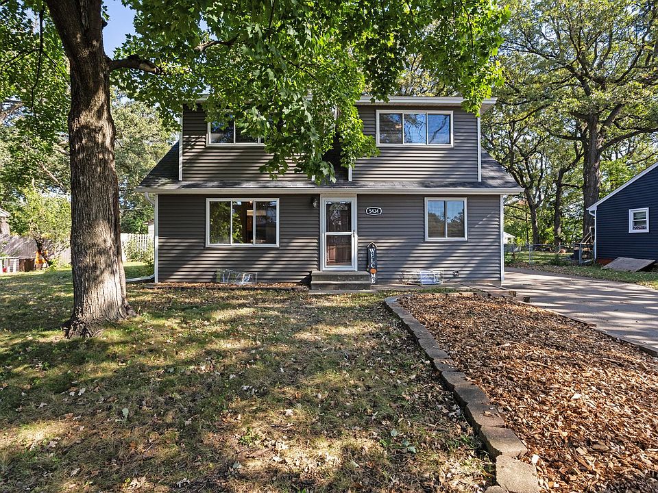 This beautiful home offers a rare blend of convenient main-level living with unbeatable potential for growth! Everything you need is right here: an Extra Large Main Floor Bedroom, a Full Bathroom, and Main Floor Laundry. The heart of the home is the stunning Living Room, featuring a Vaulted Ceiling, a Full Stone Wood-Burning Fireplace, huge windows, and a walkout to the Concrete Patio. The Kitchen comes equipped with New Appliances. Move in with complete confidence knowing all the major systems are new and worry-free: Siding, Roof, and Windows (2020); Furnace and Air Conditioning (2023); and a New Sewer Line (2025). The outdoors is an entertainer's dream, featuring a fully fenced backyard with a cozy Fire Pit, the large patio, and a large Storage Shed. For future needs, the upper level's existing bedroom could be converted into two bedrooms if needed, and the huge lower level is ready to be finished into an Additional Bedroom, Full Bathroom, and a second Living Room. This home could easily become a 3-bedroom, 2-bath layout with over 2,500 sq. ft. of living space and fantastic equity potential. Located in a great spot, you'll enjoy new parks within walking distance, popular restaurants, and an easy commute to anywhere in the cities. Highly desirable Mounds View School District! Don't miss this opportunity for immediate comfort and future value! Come see it today!