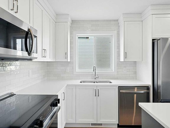 Ceiling height kitchen cabinetsQuartz countertopsEating bar islandPatio doorsLarge picture windowWalk-in closetUpper-floor laundry room