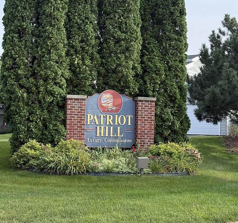 Patriot Hill Condominium!! Ranch style unit with a wooded view. 2 bedrooms, 2 baths in great condition. Maple cabinets, new appliances, gas fireplace with painted mantel, custom shelving units in all closets, new carpet and 9' ceilings. Walk in unit directly from garage that has pull down stairs in the ceiling for extra storage.