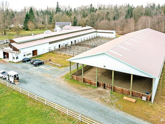Beautiful Beldar Haven Farm! A shy 100-acre equestrian facility designed to make training year-round a breeze. The large barn measures 267 x 45 & features 28-16x16 stalls w/ dream mats & attached mixed gravel/sand runs. Rider's lounge, office, tack room, feed room & 2 hot water wash racks complete the picture. Above the barn is a giant hay loft. Covered & lighted arena (193'x70') w/ viewing lounge roughed in. Acres of dry grassy turn out & certified organic (renewable). Grow your own flowers & create a wedding venue on top of a profitable farm. Turn of the century farmhouse is functional & awaiting your personal touch, Caretaker's cottage is a plus. Minutes to Sumas border. Click the movie to take in the beauty of Beldar Haven.