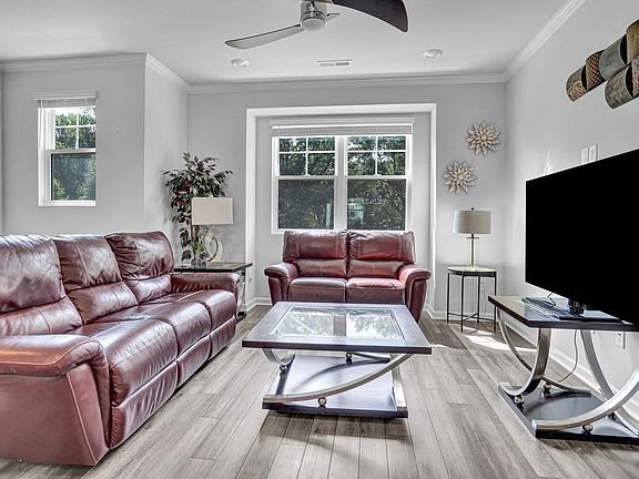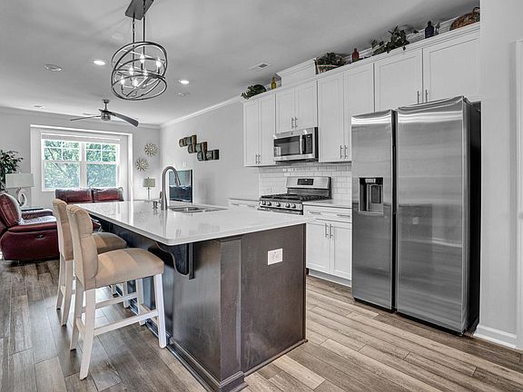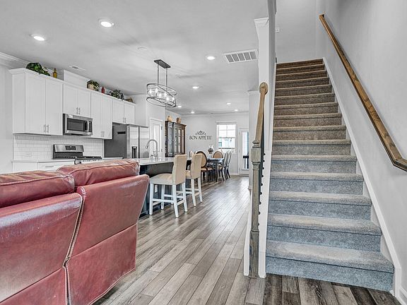 Better than new 3-story townhouse in 5401 North! Facing serene green space, this townhome is move-in ready and easy to maintain. 3 finished levels feature multiple living spaces, including a gorgeous stainless and quartz kitchen, LVP flooring on the main and second floors, and classic and modern architectural details. Open concept living on the second level with living room, kitchen and sunny breakfast area, plus a powder room and private balcony. The first level features a rear entry, oversized 1 car garage, bedroom and full bath, and entrance. The third level features the primary bedroom and bath (with double vanity, glass and tile shower, and walk-in closet,) secondary bedroom plus full bath, and laundry room. 5401 North is a live, work, play community, complete with pool, clubhouse, gym, dog park, playground, community garden, Neuse River Greenway access. Close to schools, restaurants, coffee, brewery. HOA handles grounds maintenance. Garage includes professionally installed EV charging capacity.