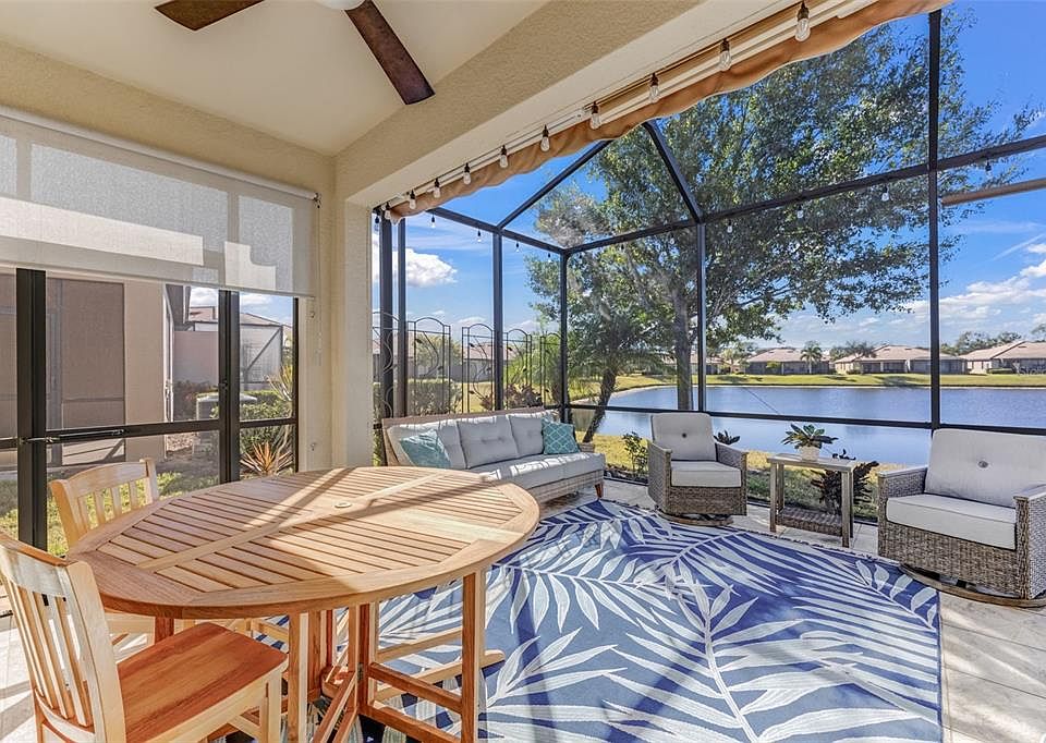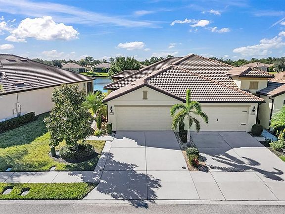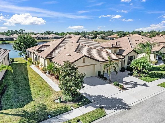 YOUR SEARCH IS OVER!!! Don’t wait to view this MOVE-IN READY…. ABSOLUTELY STUNNING VILLA. Located in the beautiful highly desirable gated 55+ Southshore Falls Del Webb Community. 2 bedrooms 2 Bath and 2 car garage villa. From the moment you arrive at this immaculately maintained home you will sense the pride of ownership. This beautiful water view home is perfectly situated on a large lot (landscaping maintained by HOA). As you enter into the gorgeous home you will be impressed with the open spacious floor plan, crown molding with tasteful overhead lighting/ceiling fans. Large bright chef's dream gourmet kitchen with beautiful tiled backsplash, quartz countertop, with plenty of workspace, gorgeous cabinets with pull out drawers, recessed lighting, and breakfast bar. Spacious dining & living room providing the perfect open floor space for relaxing and entertaining. The large master suite includes, a large walk-in closet with a completed closet system, adjoining bathroom with double vanities counters and a large walk-in frameless shower. As you step outside into your HUGE private tiled lanai enjoy the peace and quiet. No backyard neighbors. Perhaps enjoy a cup of coffee or an adult beverage with a good book or watch the ever-changing views of nature of your gorgeous Waterview. On those bright sunny days, dual electric retractable awnings provide shade. Many upgrades and extras including water softener (2025), water heater (2025), complete HVAC (2023), plantation shutters, quartz countertops, beautifully finished cabinetry crown molding, murphy bed in guest bedroom (2020), epoxy garage flooring, attic access stairs, Hurricane Shutters, Gutters, and SO MUCH MORE!! Enjoy an active adult lifestyle with resort style amenities: 14,000 sq. ft. clubhouse offers billiards, coffee/internet cafe, state of the art fitness center, library/card room, hobby/craft room and grand ballroom for parties and events! A sparkling lagoon pool and spa, resistance pool. Bocce ball, pickle ball courts, tennis courts and a putting green trail. Private roads with nature and walking trails, sidewalks and biking. Plus, the community offers numerous activities and social/special interest clubs. This gated 24-hour manned guarded community has everything you could ever need so there’s always something to do! Truly a wonderful place to entertain family and friends! Located near shopping, waterfront dining, and a short drive to the beautiful Florida beaches! No CDD. Call for an appointment to view this stunning home. EASY TO VIEW. You will not be disappointed. Welcome to your own piece of Paradise! Some furnishings available under separate purchase.