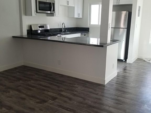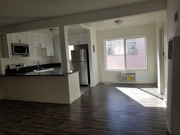 totally remodeled 1 year ago,, stainless steel appliances, all white and black look, granite, dishwasher, stover, refrigerator , air conditoning, lower, large ,pool, on street parking,close to shopping and public transportation,, 1 block from western and franklin owner pays trash and water