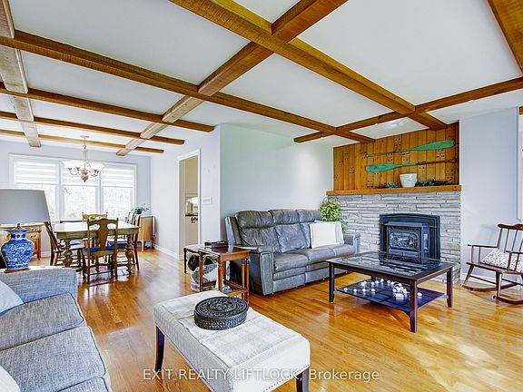 This stunning property offers the best of all worlds - riverfront living, an inground pool, and a home that radiates pride of ownership throughout. Upstairs you'll find three spacious bedrooms and a full bath, while the lower level features a fourth bedroom and an additional bathroom, perfect for guests or extended family. The interior showcases beautiful updates, including black quartz countertops, custom blinds, under-cabinet lighting, freshly painted rooms, beamed ceilings, two fireplaces, and a durable metal roof. The sunroom once housed a hot tub, and the opening remains, making it easy to reinstall should the new owners wish to bring it back. Outside, this property truly shines. On one side, you'll find frontage on the Indian River, ideal for kayaking, tubing, or simply relaxing by the water. There's also a large firepit area with a gazebo, perfect for cozy evenings under the stars. On the other side, an inground pool surrounded by stamped concrete and a beautiful patio creates the ultimate space for summer relaxation and entertaining. Additional features include a double-car garage, an insulated bunkie, and a large lot adorned with mature trees, including a picturesque willow. Whether you're looking for a year-round home or a peaceful weekend getaway, this property offers comfort, style, and serenity in one incredible package. Fibre Optics Internet. Please see the attached feature sheet for a full list of upgrades.