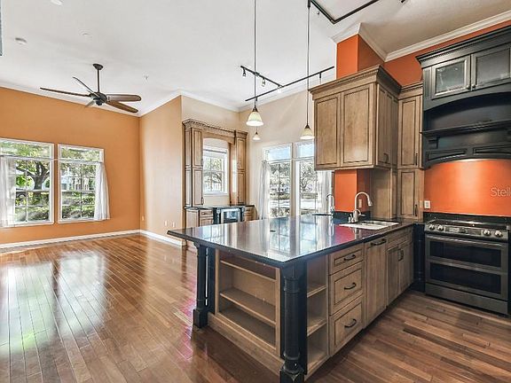 Beautiful downtown Celebration condo. Ground floor corner unit with great views of Market Street. The unit has been totally remodeled and upgraded. Includes a rare detached one car garage. Easy access: Front door / Back door / Close parking. Porch overlooking Water Street Canal One of a few units with 12 ft ceiling and Crown Molding Bathroom remodel with deep walk in jacuzzi tub Total kitchen remodel with high end cabinetry and appliances/ large siltstone countertop/ Wet bar / Drink station / Built in nugget ice maker / Instant hot water drink faucet Brazilian cherry hardwood floors throughout stacked washer dryer Very Rare detached one car garage . Near complex exercise room
