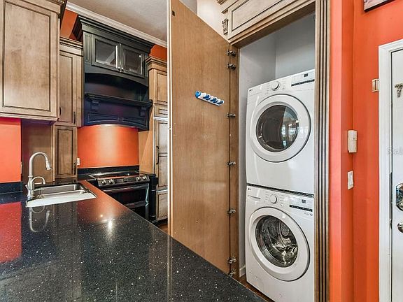 Drink stationLarge siltstone countertopStacked washer dryerWet barCorner unitBrazilian cherry hardwood floorsCrown molding