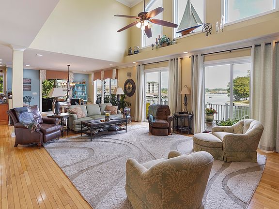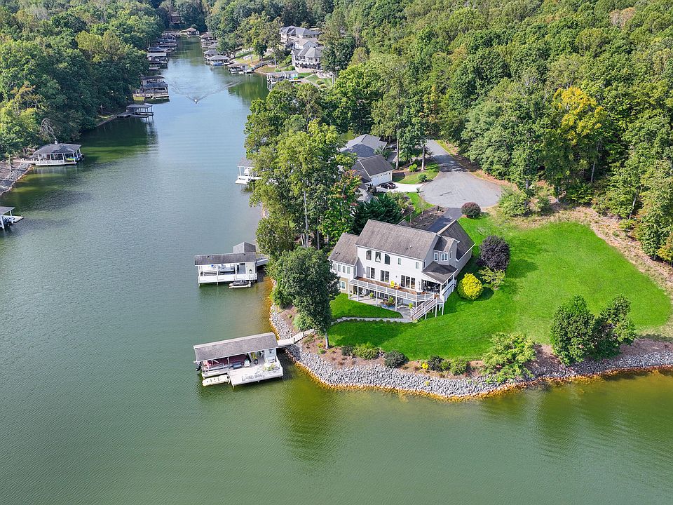 Wake up to the most incredible sunrises at this amazing one of a kind lakefront home that has the most popular location on the lake, Very spacious w/4 bedrooms & all having a view of the lake, 3.1 baths, office & approx. 5,062 sq. ft finished & 682 sq ft unfinished. Situated on a beautiful point lot w/190' of waterfront! Huge gourmet kitchen w/island, wine bar & granite countertops. Breakfast Bar & Dining Area overlooking the lake. Great room w/high ceilings, built-in bookshelves, wood floors, stone fireplace & a wall of glass windows for an amazing view. Upper level game room w/dry bar. In-law suite on the lower level w/kitchen, Living room, dining area & 2nd primary bedroom suite. Oversized 2 Car Garage, Covered Boathouse w/a no wake zone for safe lake swimming. Covered & open deck The wrap-around deck is great for entertaining lots of family and friends with all the fun things going on at Bridgewater Plaza but if you need peace and quiet, just step inside the house because you can not hear anything going on outside! The deck is one the owner's favorite places to be with part of the deck is covered and the the rest of the deck is open. Upper level has a large unfinished room that that is duct for heating & air. The room could be finished for a theater room or another sleeping area. Game room has a dry bar with a mini fridge & snacks. 2 laundry rooms: one is located on the main level of the home and the second one is located in the in-law suite. In-law suite has LVP flooring and a patio to sit outside. Lower level also has a huge unfinished area with double doors that could be finished for more living space, or could be used for a workshop, lower garage and is being used for yard equipment & storage currently. The survey shows .35 above the 800' contour & 1.108 below the 800' contour. Central Vac, 3 Heat Pumps (Main level is a newer heat pump, lower level heat pump is approx 4 years old). The kitchen is huge with so much counter space. There is refrigerator, cooktop with downdraft, convection wall oven, convection microwave that can be a second oven, trash compactor, dishwasher. There is a refrigerator in the kitchen, one on the dock, the mini bar on upper level and one on lower level. Freezer in garage is coveys. Irrigation system uses lake water and pump is located on the boathouse. Wood floors on main level have been sanded with 2 coats of stain on them. The foyer has an in-wall aquarium and it can removed if you do not like fish tanks! Double insulated wall between Great room and primary bedroom for more privacy and quietness. Pool table in the Game Room conveys with the house. The sun rises on the lakeside of the house and the sun sets on the front side of the house. Deep water at dock. Property lines extend under the 800' and plat is available under documents. Waterfrontage is estimated.