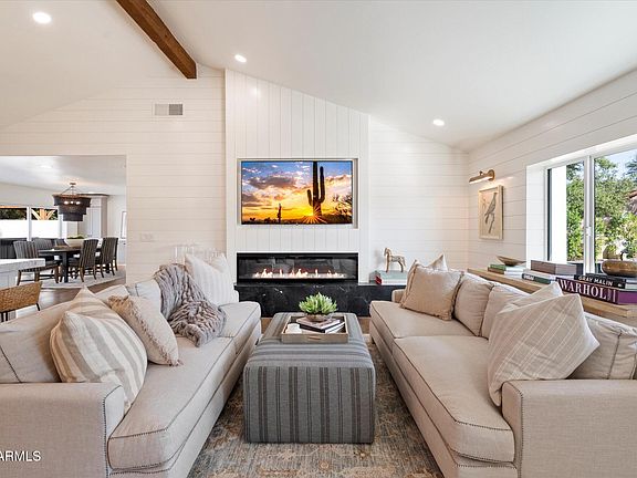 Welcome Home to your custom 3-bedroom, 3 bathroom dream home in a highly sought-after area of Scottsdale with no HOA! This stunning single level property has been fully re-imagined by the design talents of 555 Angel Designs and is now in immaculate condition. As you enter the home, you'll be greeted by a spacious and open floor plan. The living area features custom woodwork and lots of natural light, creating a warm and inviting atmosphere. The kitchen is a chef's dream, featuring brand-new top-of-the-line appliances, honed marble countertops, a spacious island, and custom cabinetry — all designed to make cooking and entertaining effortless. The adjacent dining area is perfect for hosting dinner parties or casual meals with family and friends. A beautifully appointed wine and beverage bar is integrated into the dining room, complete with an under-cabinet wine refrigerator, beverage cooler, and serving counter, offering a sophisticated focal point for hosting.