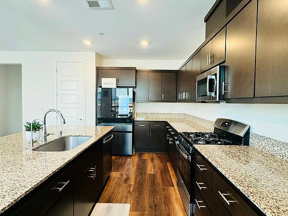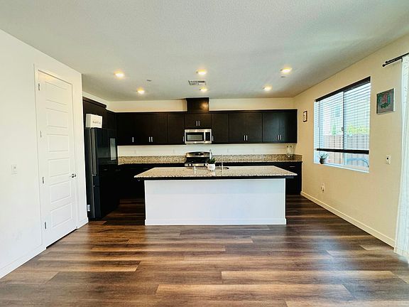 The main level offers a full bedroom and full bath, ideal for guests or multigenerational living. An open-concept kitchen with brown cabinetry and stainless steel appliances flows seamlessly into the light-filled dining and living areas. Upstairs, a versatile loft is perfect for a playroom, theater, or home office. The second floor also includes a dedicated laundry room, a spacious primary suite with walk-in closet, double vanity, and walk-in shower, plus two additional bedrooms and another full bath.